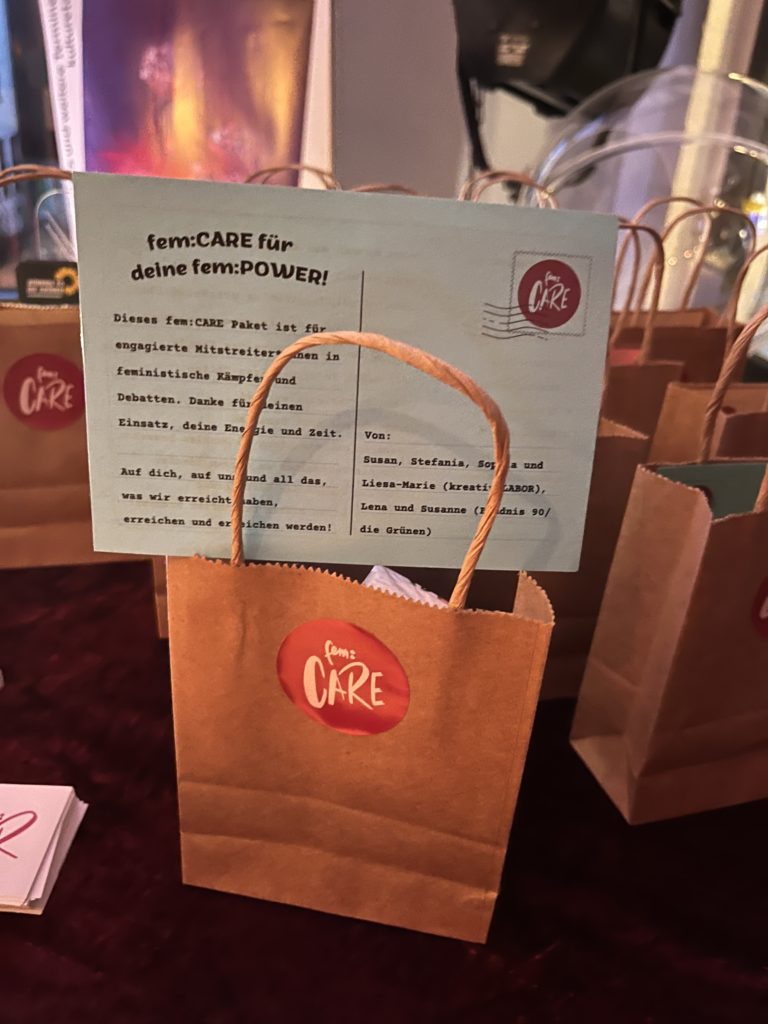 Im cine K wurde am 8. März 2024 der Film „Aufräumen“ von Claudia Richarz gezeigt. Er handelt von dem Leben der Feministin und Filmemacherin Helke Sander. Im Anschluss der Veranstaltung haben wir unsere fem:CARE Päckchen verteilt für Kraft, Inspiration, Herzenswärme und Ausdauer.